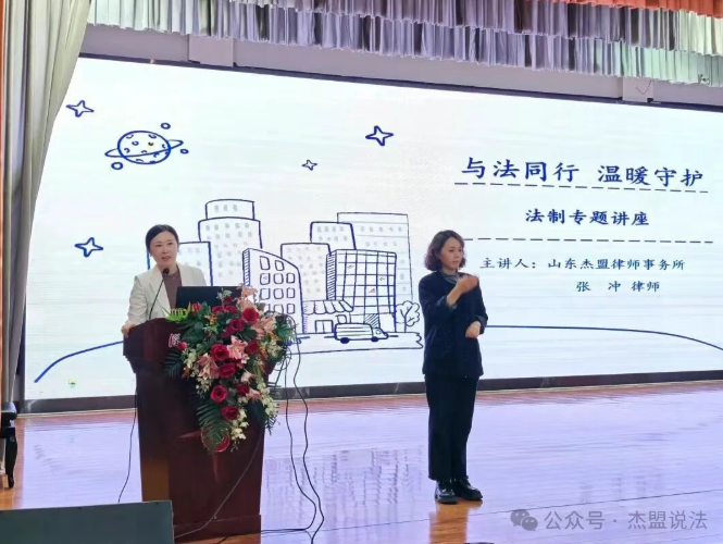 为进一步加强法治宣传教育,关爱特殊未成年人的健康成长。10月17日,山东杰盟律师事务所张冲律师走进淄博特殊教育中心,以“与法同行,温暖守护”为主题,在手语老师的配合下,通过一个个鲜活的案例,为特殊教育学校的同学们开展了一堂有温度、有深度、有乐趣的法治公开课,助力孩子们在法治阳光下树立守法意识与规则意识,为青春成长筑牢法治“防护盾”。