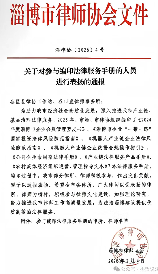 近日,淄博市律师协会发布《淄律协〔2026〕4号》文件,对在2025年度编印系列法律服务手册工作中作出突出贡献的律师事务所和律师予以通报表扬。我所许跃东律师获得表扬。